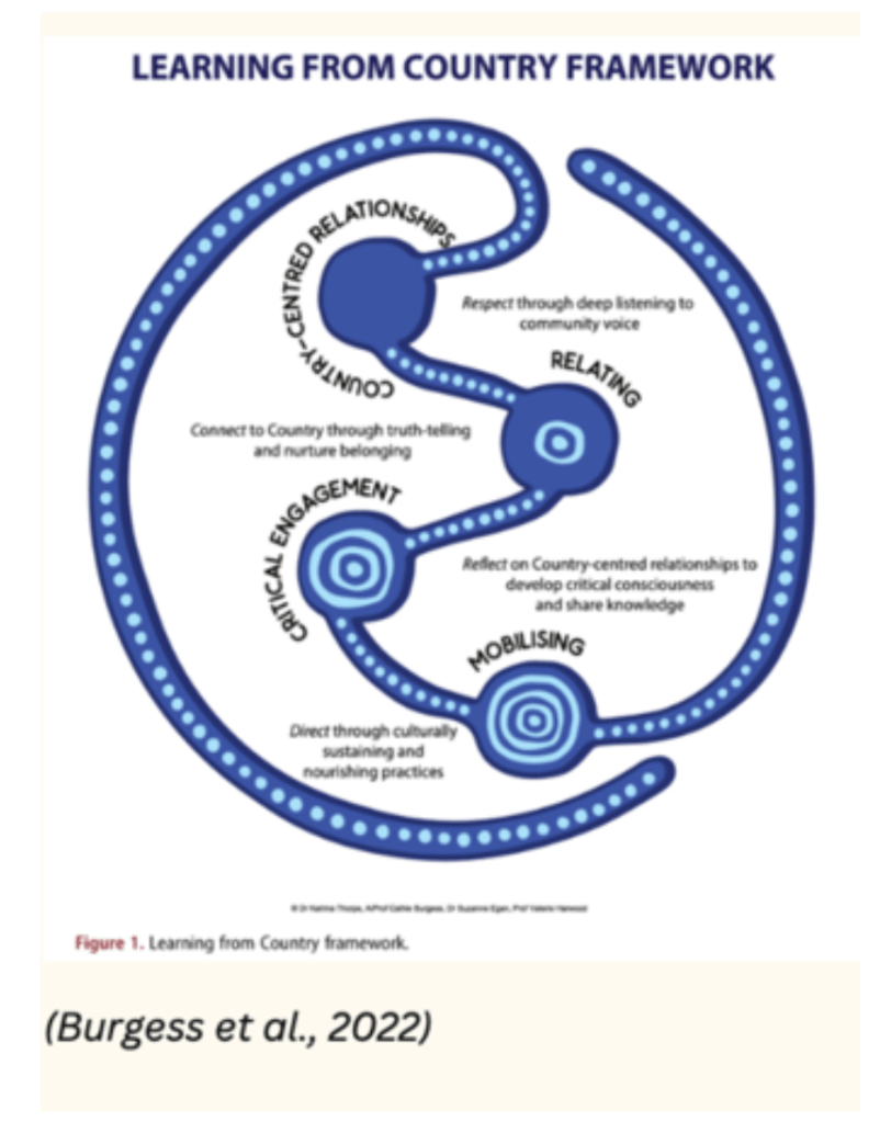 Country-centred relationships requires deep listening to and learning from Country, is articulated through individual and collective Aboriginal voices, experiences and relationships with Country and community over time.